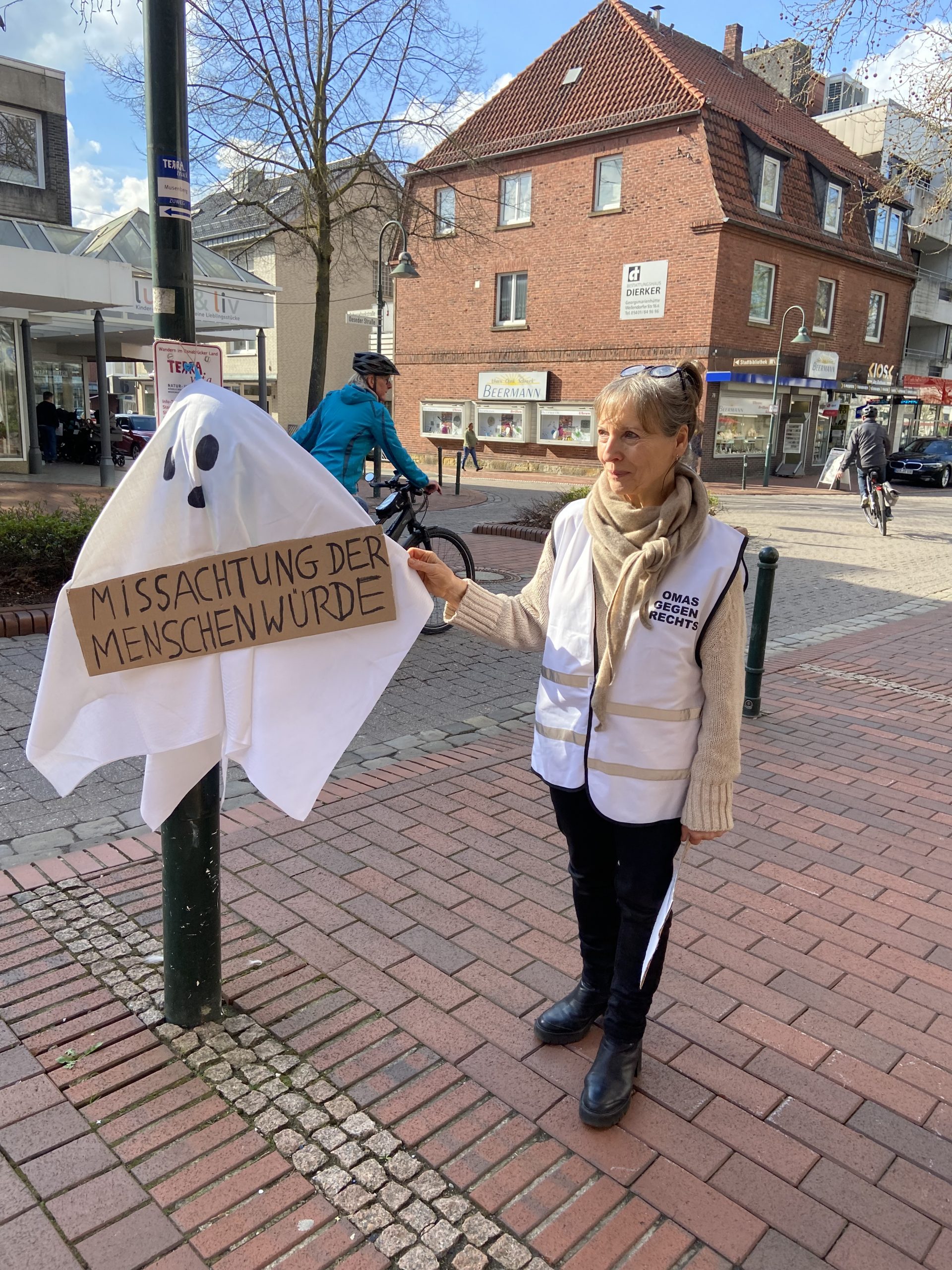 Montag, 20.05.2024 – Mahnwache der OMAS GEGEN RECHTS Georgsmarienhütte am fehlenden Stolperstein der Bernhardine Mönkediek. Eine Schülerin der Realschule stellte sich zu uns und drückte ihr Unverständnis für diesen Diebstahl aus. Empörte OMAS –Foto OGR Gmh
